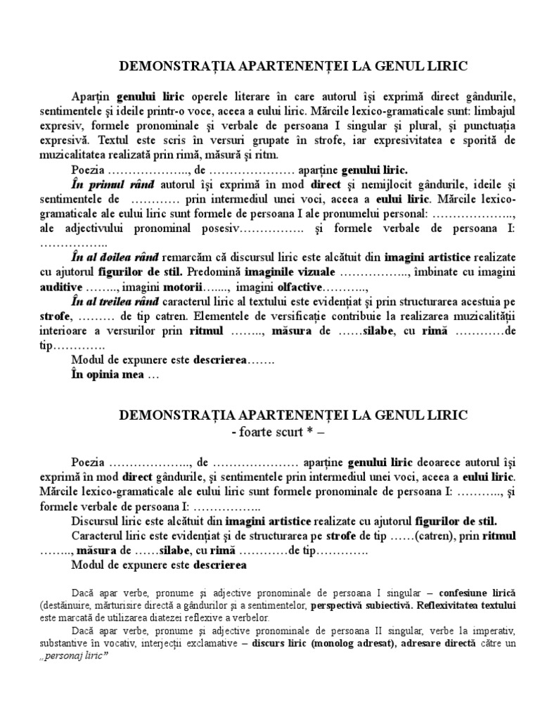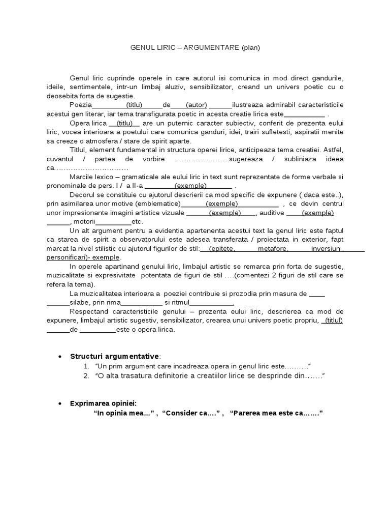 Model argumentare gen liric. Genul liric a carui denumire privine de la cuvantul lira instrument muzical cu care se acompania recitarea unor creatii literare cuprinde totalitatea creatiilor lirice adica a acelor opere literare in care autorul isi exprima direct propriile gandurii idei si emotii fiind prezent si eul liric. 27 februarie 2015 21 19. 0 stele 0 review uri. Genuri si specii literare modele de argumentari.