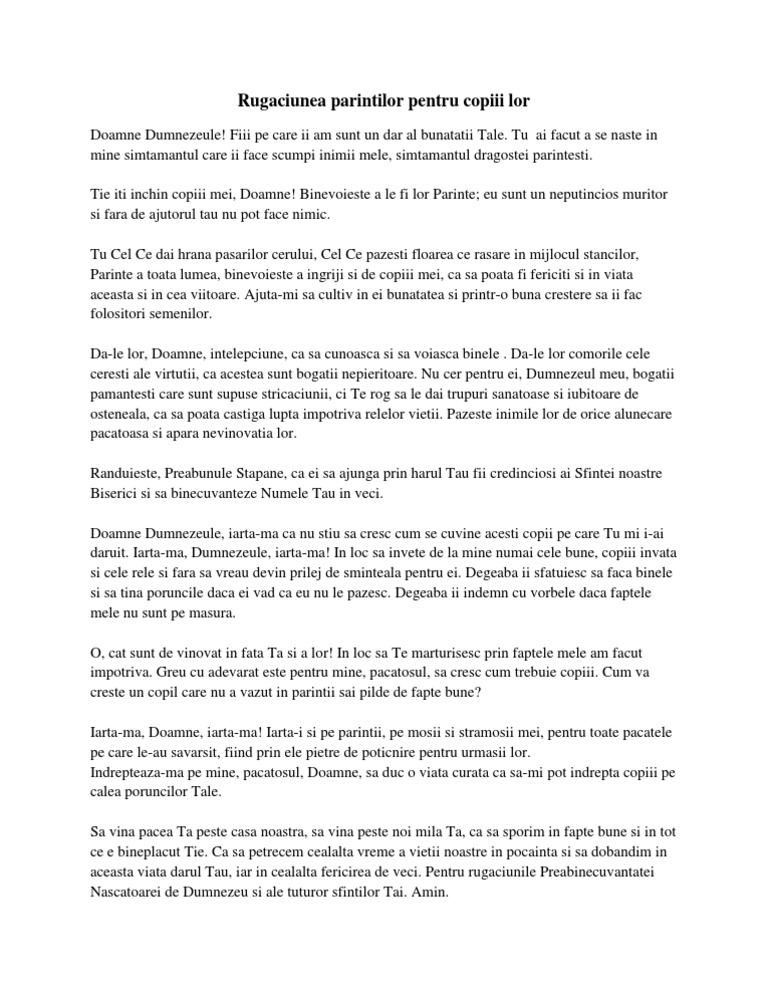 Asaza intru ei credinta tare invata i pe ei cucernicia inaintea ta si invredniceste i pe ei sa te iubeasca cu putere pe tine zidi torul si mantuitorul nostru. Rugaciunea parintilor pentru copii doamne dumnezeul nostru cel ce cu intelepciunea ta ai zidit pe om din tarana si ai suflat in fata lui suflare de viata si binecuvantandu l ai zis cresteti si va inmultiti si umpleti pamantul iar la cana galileii prin unul nascut fiul tau ai binecuvantat nunta si deci nasterea de fii cu multa umilinta rog marea ta bunatate ca neincetat sa reversi. Ocroteşte i prin rugăciunile tale fii lor povăţuitor pe calea adevărului şi fereşte i de toată ispita şi. Creș teți și vă înmulțiți și um pleți pământul.